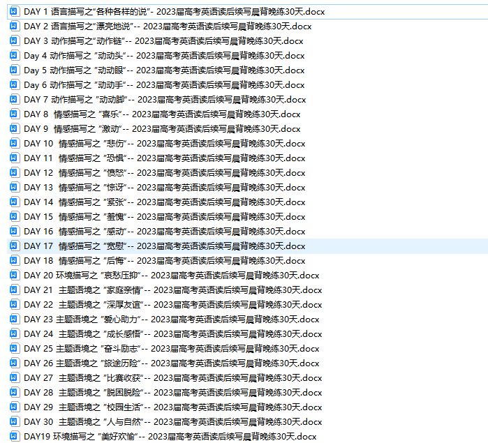 2023届高考英语读后续写晨背晚练30天 高考专栏 1.19k 2023届高考英语读后续写晨背晚练30天 《2023届高考英语读后续写晨背晚练30天》包含学案和课件,由“晨背–素材积累”和“晚练–素材运用”两大板块构成。“晨背”部分提供读后续写中语言、动作、情感、心理和环境等细节描写相关的词汇、语块和句型三种语料,“晚练”部分创设素材运用的完成句子和微写作等情境。早读积累素材,晚练运用素材,注重基础培养,重视写作过程,助力高考写作拿高分。 资源下载下载价格VIP专享仅限VIP下载升级VIP请先登录开通会员可畅享全站资料免费下载,限时优惠活动正在进行中。 有任何疑问请联系客服(微信):xbt648